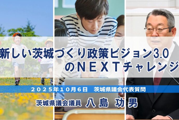 2025年10月6日に行われた茨城県議会代表質問で、県議会公明党の八島功男議員が登壇し、3期目の当選を果たした大井川和彦知事に対し祝意を述べました。
