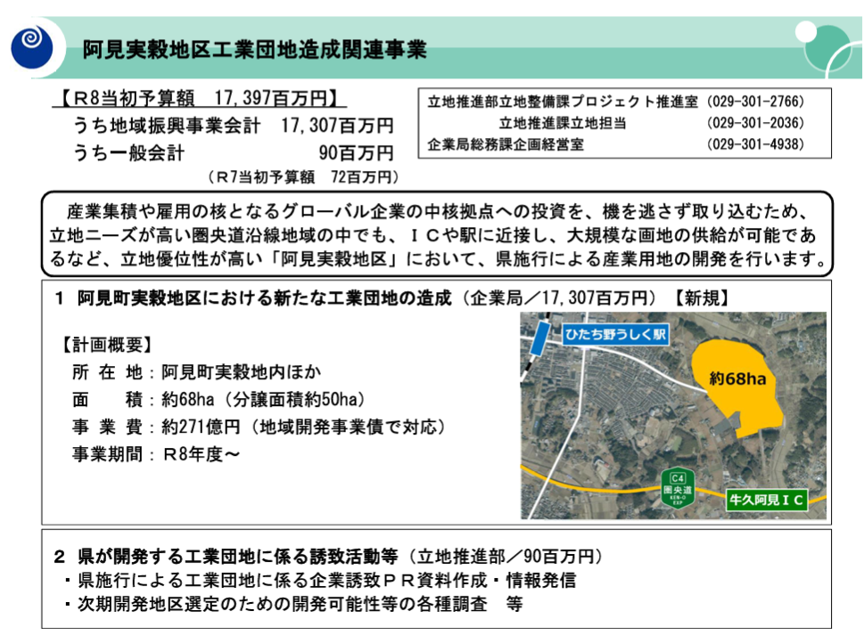 また、阿見町実穀地区における新たな工業団地の整備も大きな柱です。今回の予算では、用地取得や造成関連業務として約84億円の債務負担行為が計上されました。ここでは、データセンターや半導体関連産業など、これからの時代を牽引するグローバル企業の拠点誘致が期待されています。土浦市に隣接する地域での産業集積は、雇用創出や地域経済の活性化に大きく貢献し、県南地域全体の成長を後押しすることになるでしょう。